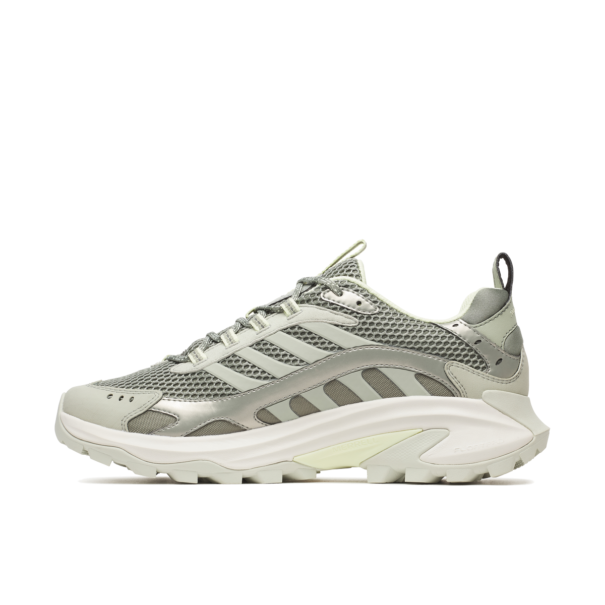 O Moab Speed 2 Vent 2K SE apresenta couro sintético, malha reciclada, FloatPro Foam e sola Vibram TC5+ com 30% borracha reciclada.