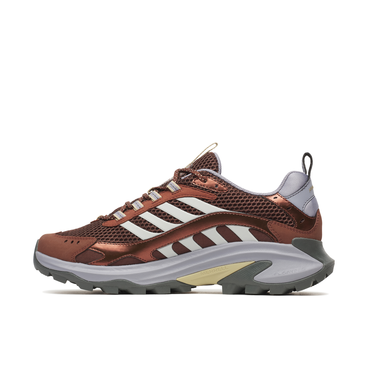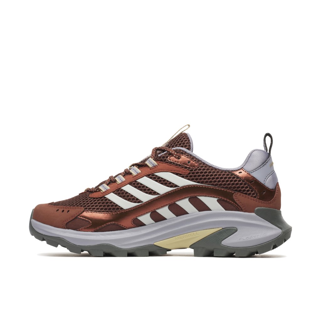 O Moab Speed 2 Vent 2K SE apresenta couro sintético, malha reciclada, FloatPro Foam e sola Vibram TC5+ com 30% borracha reciclada.